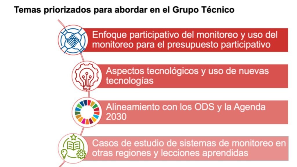 El segundo bloque presentó los avances del Grupo Técnico del Monitoreo del Desarrollo Sostenible y estuvo a cargo de Evelyn Contreras del MinSus. En esa línea, señaló que los temas priorizados por los miembros del grupo fueron: (1) enfoque participativo del monitoreo y uso del monitoreo para el presupuesto participativo; (2) aspectos tecnológicos y uso de nuevas tecnologías; (3) alineamiento con los ODS y la Agenda 2030; y (4) casos de estudio de sistemas de monitoreo en otras regiones y lecciones aprendidas.