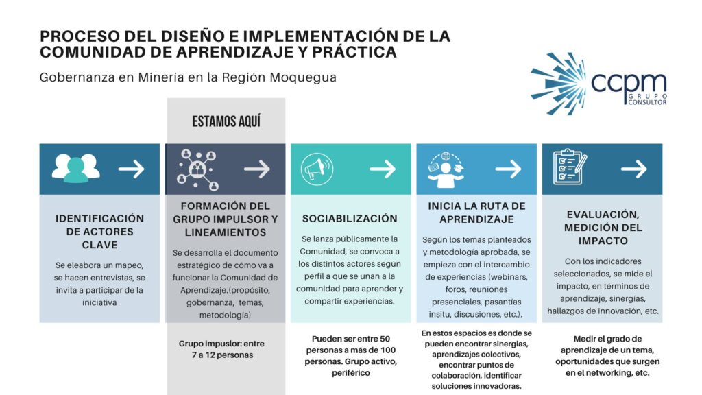 A la fecha, la Comunidad de Aprendizaje y Práctica cuenta con un primer documento fundacional y además se ha consolidado el primer Grupo Impulsor que está conformado por las siguientes instituciones: La Mesa de Concertación de Lucha Contra la Pobreza en Moquegua, Gobierno Regional de Moquegua, CEOP Ilo, Cámara de Comercio e Industria de Moquegua, Propuesta Ciudadana, EITI, Fondo de Desarrollo de Moquegua, Colegio profesional de Economía, Instituto de Formación Social, Moquegua Crece, Minera Hampton Perú, Compañía Minera Southern Perú Corporation, MINSUS-GIZ, Compañía Minera Anglo American Perú, Colectivo Frida Morante Soria, MC Inversiones Perú SAC (subsidiaria de Mitsubishi Corporation).